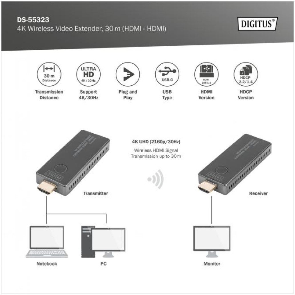 Brezžično prenaša video in avdio signale HDMI v UHD 4K/30Hz na razdaljo do 30 m z neoviranim pogledom