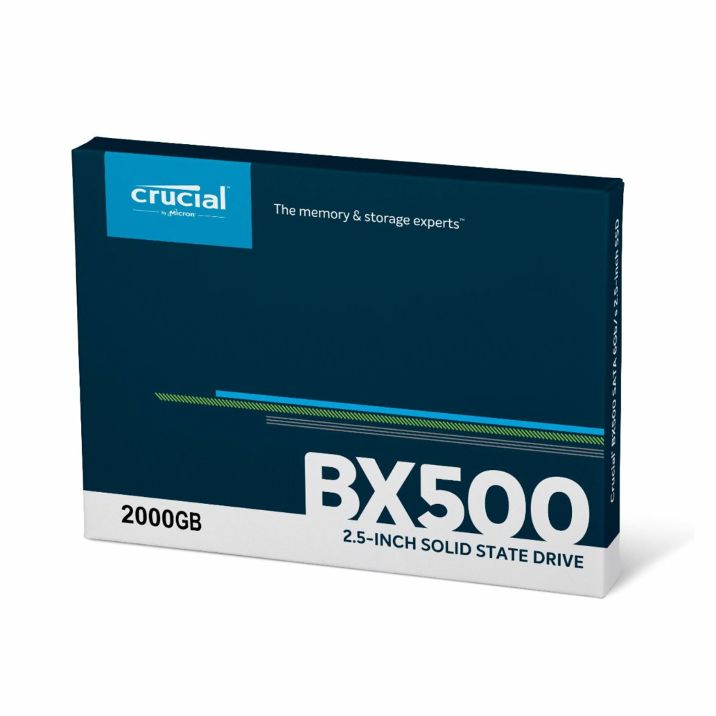 Crucial BX500. Kapaciteta pomnilnika SSD: 2000 GB, Faktor oblike SSD: 2,5 “, hitrost branja: 540 MB / s, hitrost pisanja: 500 MB / s, hitrost prenosa podatkov: 6 Gbit / s, komponenta za: prenosnik