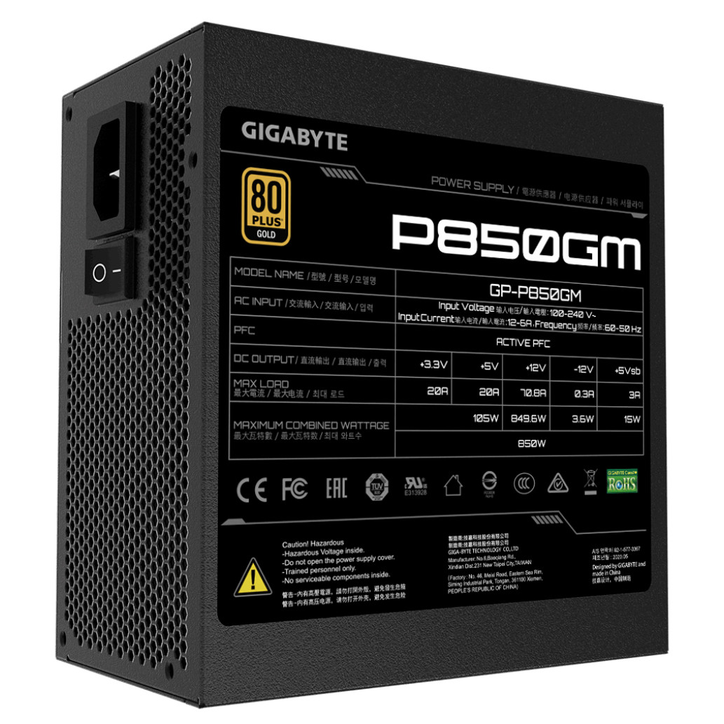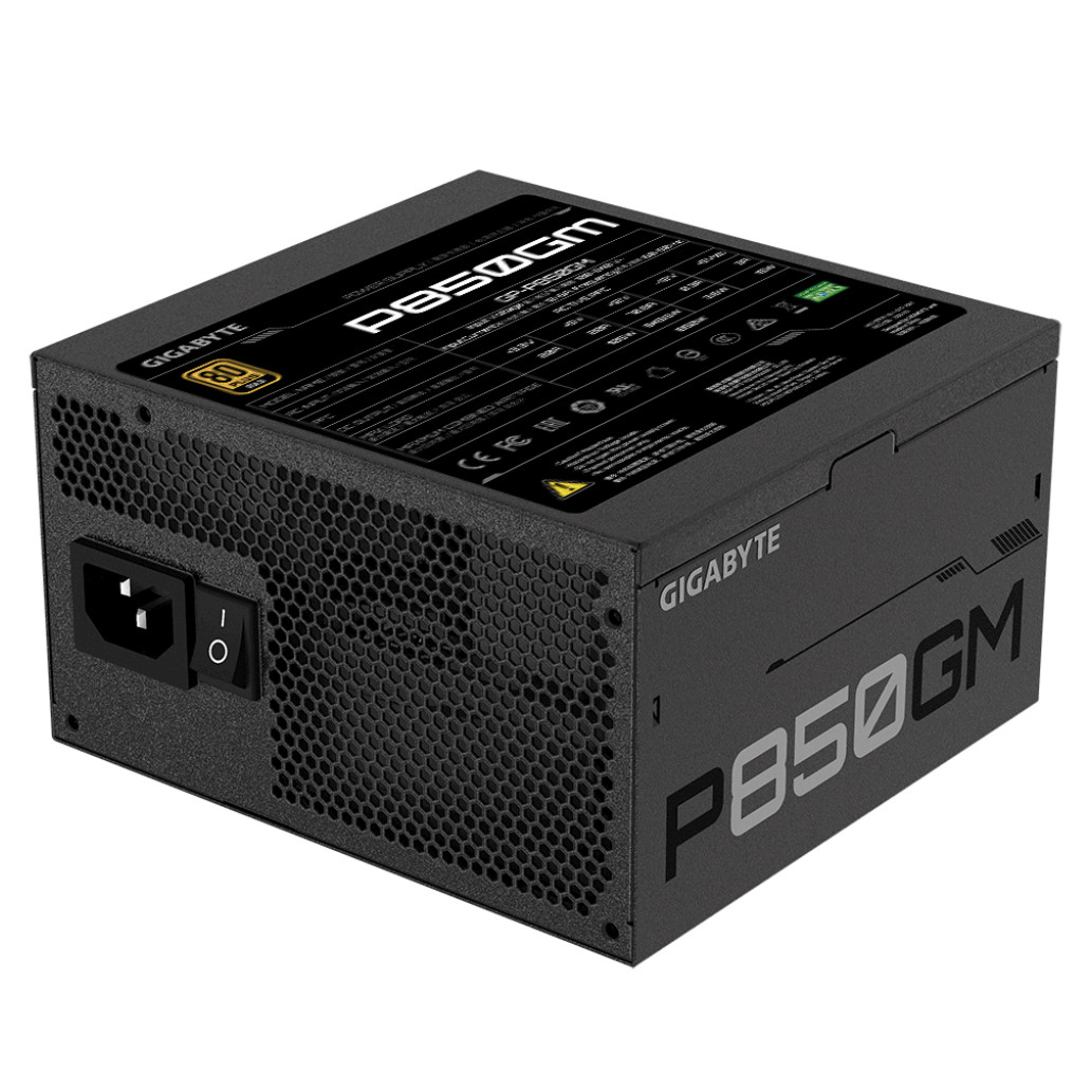 Gigabyte P850GM. Skupna moč: 850 W, AC vhodna napetost: 100 – 240 V, AC vhodna frekvenca: 50/60 Hz Konektor za matično ploščo: 20 + 4 pin ATX, dolžina napajalnega kabla matična plošča: 61 cm, dolžina napajalnega kabla SATA: 600,750,900 mm. Namen: osebni računalnik, napajalnik (PSU) Faktor oblike: ATX, 80 Plus Certifikat: 80 PLUS Gold. Barva izdelka: Črna, Hlajenje: Aktivno, Premer ventilatorja: 12 cm. Širina: 150 mm, globina: 140 mm, višina: 86 mm