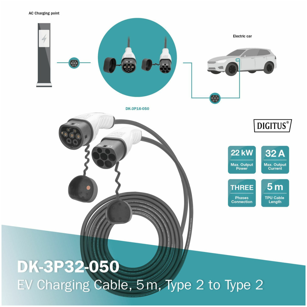 Polnjenje – Trifazni polnilni kabli za maks. 22 kW / 32A se večinoma uporabljajo doma za nočno polnjenje – kabel dolžine 5 metrov zadostuje za večino električnih vozil in situacij polnjenja.