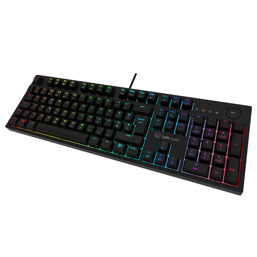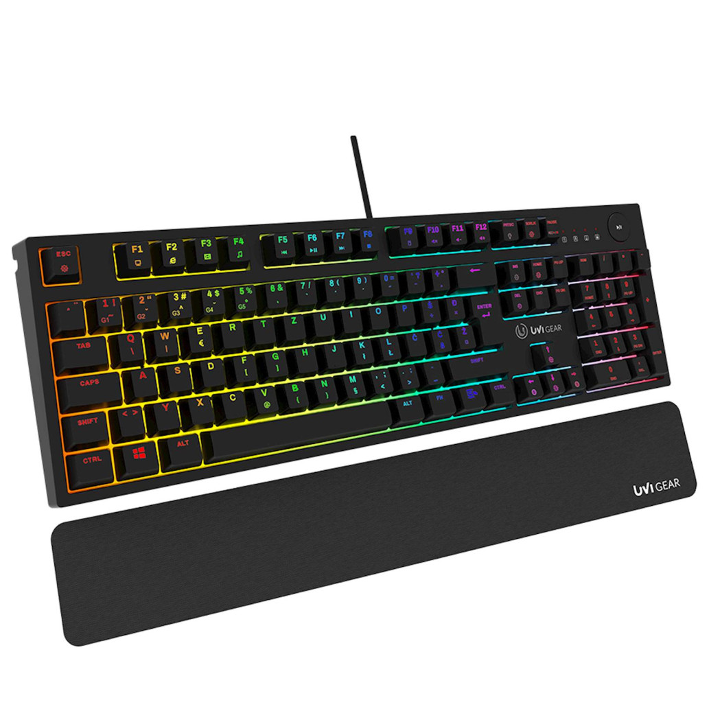 UVI PRIDE V2 je optična+mehanska gaming tipkovnica z modrimi stikali in slovensko postavitvijo (UK, SLO/CRO postavitev tipk). UVI Pride V2 uporablja najnovejšo tehnologijo stikal z infrardečim senzorjem. Odzivni čas OPTIČNIH+MEHANSKIH modrih stikal je samo 0,2 ms. To je 30% hitreje od običajnih mehanskih stikal, kar ustvari superiorno gaming izkušnjo! Izbiraj med 19 različnimi RGB efekti osvetlitve in 16,8 milijona različnih barv. Prilagodi intenzivnost in hitrost osvetlitve ter si ustvari idealno RGB osvetlitev v aplikaciji UVI One. Enostaven nadzor zvočnih nastavitev z namensko medijsko tipko – za nadzor glasnosti in predvajanje ter premor. Za lažjo dostopnost se nahaja na desni strani tipkovnice. Ob nakupu tipkovnice UVI Pride V2 prejmeš tudi podporo za zapestja, ki poskrbi za dodatno udobje med celodnevnimi gaming seansami ali urami tipkanja! UVI Pride V2 je združljiva z Windows in macOS operacijskima sistemoma ter PlayStation 4 in 5 kot tudi XBOX konzolami. UVI Pride V2 ima prilagodljivi nogici, ki omogočata tri različne naklone tipkovnice. Na spodnjem delu kanal, ki omogoča elegantno ureditev kabla po sredini, levi ali desni strani.