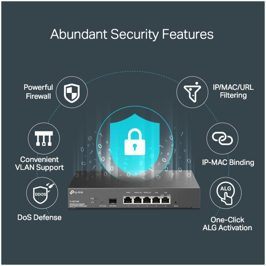 TL-ER7206 podpira različne VPN protokole vključno z IPsec, PPTP, L2TP VPN načini in lahko upravlja tudi s prehodnim prometom. Vgrajen strojni NAT pogon omogoča usmerjevalniku podporo in upravljanje do 100 LAN-to-LAN/Client-to-LAN IPsec VPN povezave, 50? OpenVPN*, 50? L2TP, in 50? PPTP VPN. Napredne VPN funkcije vključujejo DES/3DES/AES128/AES192/AES256 enkripcijo, MD5/SHA1 avtentifikacijo, NAT Traversal(NAT-T), Dead Peer Detection(DPD), Perfect Forward Secrecy(PFS).