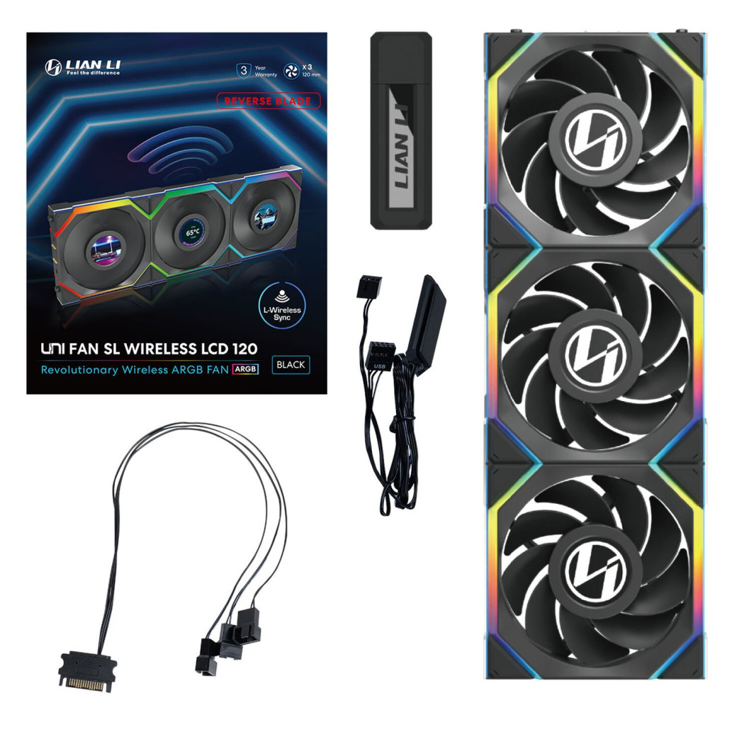 Lian Li UNI FAN SL brezžični LCD 120 ARGB Reverse Blade 3-Pack | Ventilator ohišja, UNI FAN SL Wireless 120 ARGB / 3x 120 mm ventilatorji /
